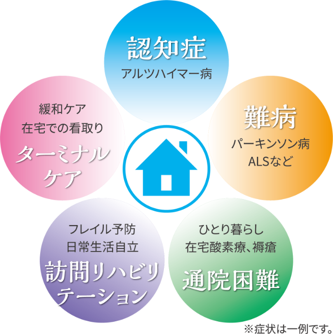 各専門職のもとチームで患者様それぞれの環境に合わせた医療を相談することができ、住み慣れたご自宅で様々なケアを受けることができます。